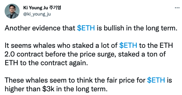 그는 “누군가 오늘 많은 양의 이더리움을 이더리움2.0 스테이킹 컨트랙트에 넣었다”면서 “이더리움 고래는 ETH 가격이 장기적으로 3000달러를 돌파할 거라고 생각하는 거 같다”고 부연했다.