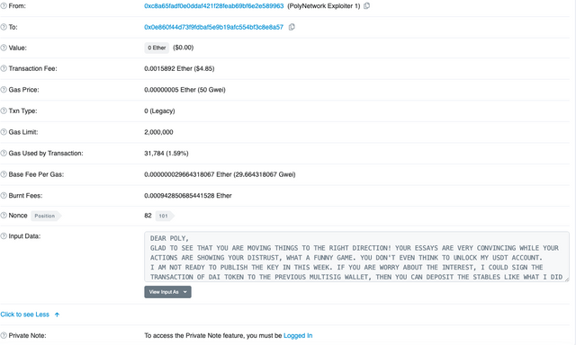 폴리네트워크를 공격해 6억달러(한화 약 7000억원) 규모의 가상자산(암호화폐)을 탈취했던 해커가 한국시간 18일 9시 16분경 이더리움 블록에 보내는 메시지를 통해 “올바른 방향으로 나아가고 있다니 기쁘다. 다만 당신은 동결해버린 내 테더(USDT) 계좌를 열 생각도 하지 않고 있다. 웃기는 처사에 불신감만 커진다. 이번주에는 개인키를 제공할 준비가 안 됐다”고 발언했다.