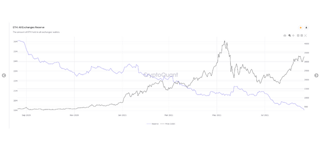 가상자산(암호화폐) 분석기업 크립토퀀트가 자체 발행하는 다이제스트(텔레그램)는 22일 “가상자산 거래소에서 보유한 이더리움(ETH)의 양이 지난 5월 이후 최저치를 기록했다. 반면 이더리움2.0 스테이킹에 예치된 ETH 물량은 최고치를 경신했다”고 말했다.