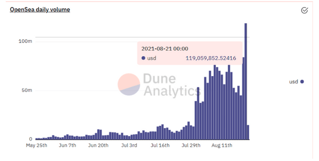 가상자산(암호화폐) 데이터 분석 업체인 듄 애널리틱스 데이터에 따르면 대체불가토큰(NFT) 플랫폼 오픈씨(OpenSea) 일일 거래량이 21일(현지시간) 처음으로 1억달러(한화 약 1183억원)을 돌파했다.