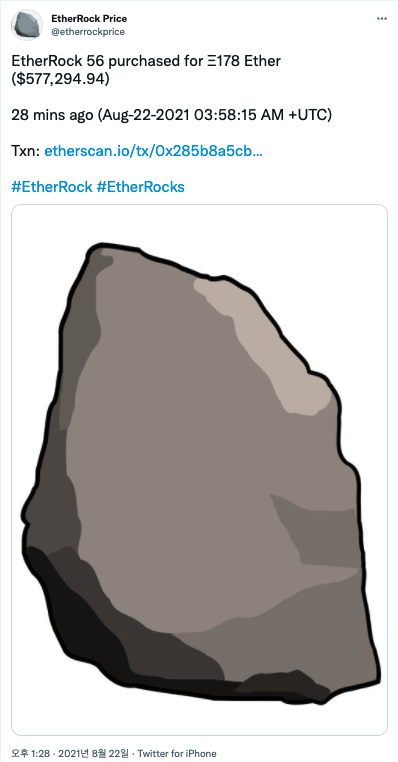'애완 돌' 대체불가토큰(NFT)으로 유명한 이더락(EtherRocks, 사진)이 22일 178이더(ETH)에 판매되면서 사상 최고가를 경신했다.