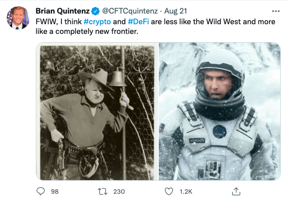 브라이언 퀸텐즈(Brian Quintenz) 전 상품선물거래위원회(CFTC) 위원은 지난 21일 트위터를 통해 “내 생각일 뿐이지만 가상자산(암호화폐)와 탈중앙화금융(디파이)는 황야라기 보단 완전한 미개척지에 가깝다”고 발언했다.