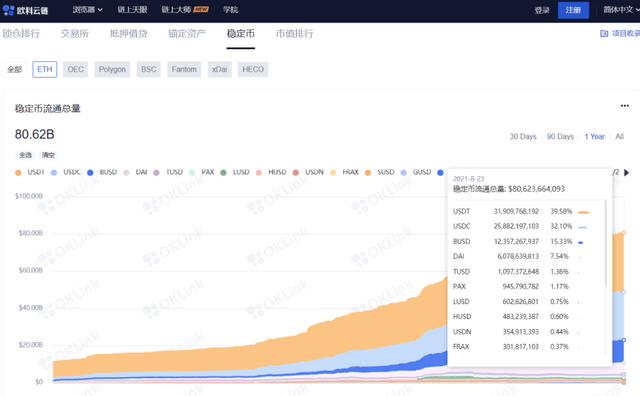 가상자산(암호화폐) 전문 미디어 8비티씨는 가상자산 분석업체인 오케이링크 데이터를 인용하며 “이더리움에서 발행한 스테이블코인의 유통량이 806억2000만 달러를 돌파했다. 올해 동안에만 284% 증가했다”고 분석했다.