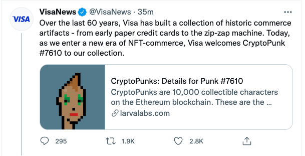 비자(VISA)는 트위터를 통해 23일 “우리는 크립토펑크(CryptoPunks) 대체불가토큰(NFT) 7619번 캐릭터를 구매했다”고 밝혔다.