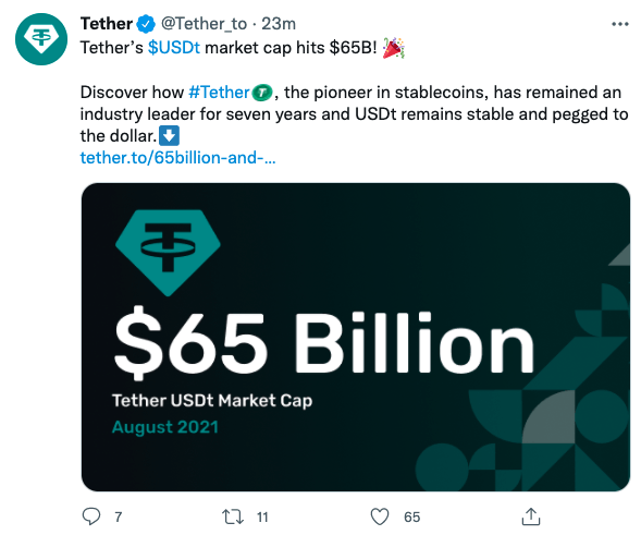 테더(USDT)가 23일 트위터를 통해 “USDT 시가총액이 650억달러(한화 약 76조1800억원)을 돌파했다”고 말했다.