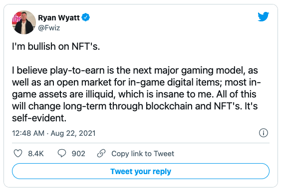 라이언 와이어트(Rayn Wyatt) 유튜브 게임책임자는 지난 22일 트위터를 통해 “나는 대체불가토큰(NFT)을 낙관적으로 본다. 장기적으로 NFT가 게임산업을 모두 바꿀 것이다”라고 발언했다.