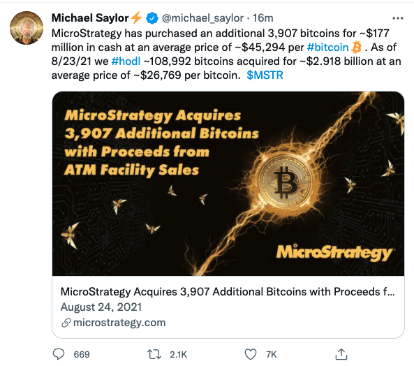 마이클 세일러(Michael Saylor) 마이크로스트레티지 최고경영자(CEO)는 24일 트위터를 통해 “마이크로스트레티지는 비트코인 3907개(1억7700만달러 상당)를 추가 구매했다. 평단가는 4만5294달러”라고 밝혔다.
