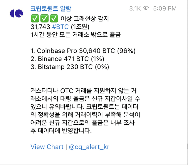 가상자산(암호화폐) 분석 업체인 크립토퀀트 알람에 따르면 25일 16시부터 한시간 동안 3만1743BTC가 거래소에서 출금됐다. 전송된 비트코인(BTC)은 총 1조7000억원에 상당하는 규모다.