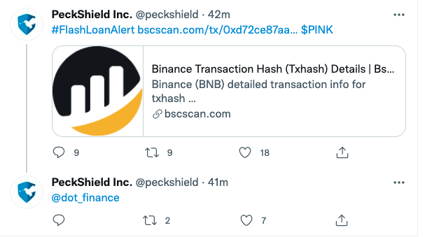 블록체인 보안회사 팩실드(PeckShield)는 25일 트위터를 통해 “폴카닷의 탈중앙화금융(디파이) 프로젝트인 도트파이낸스(PINK)가 해커의 플래시론 공격을 받은 것으로 보인다”고 밝혔다.