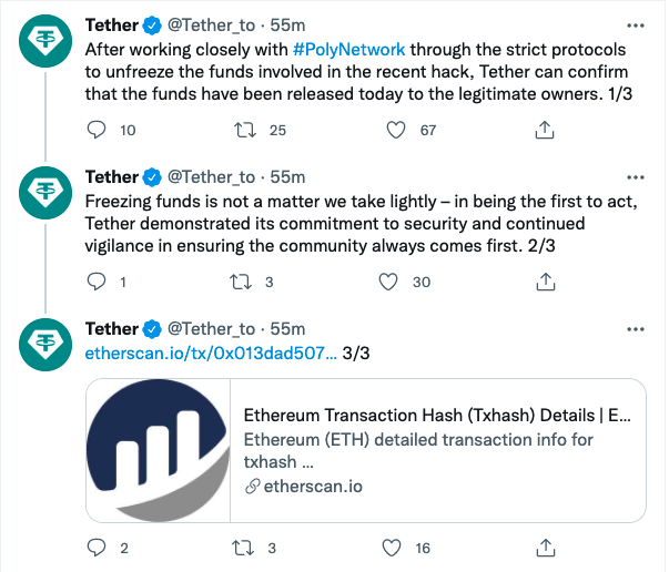 테더(USDT)는 25일 오후 9시 41분경(한국시간) 트위터를 통해 “우리는 폴리네트워크와 긴밀히 협력해 최근 해킹사태에 동결 조치한 3300만USDT를 동결 해제한다”고 밝혔다.