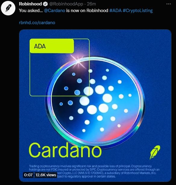 1일(현지시간) 글로벌 금융 거래 플랫폼 로빈후드(Robinhood)가 공식 트위터를 통해 카르다노(ADA)를 상장한다고 밝혔다.