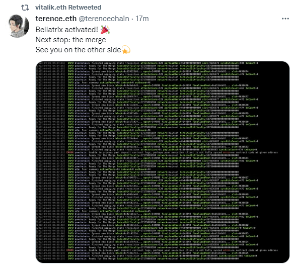 6일(현지시간) 비탈릭 부테린 이더리움(ETH) 공동설립자가 "벨라트릭스가 활성화됐다. 다음 단계는 '더 머지(The Merge)'다"는 트윗을 리트윗했다.