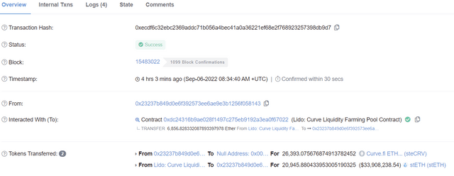 블록체인 분석 플랫폼 난센이 쓰리애로우케피탈(3AC, Three Arrows Capital) 소유로 표시한 주소(0x23...8143)가 커브 파이낸스(CRV)에서 2만945여개의 스테이킹된 이더리움(stETH)을 출금했다.