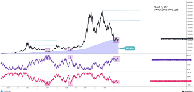 13일(현지시간) 크립토퀀트 저자 우민규는 기고문을 통해 "비트코인은 가까운 미래에 안도랠리가 발생할 가능성이 있다"며 "역사적으로 비트코인은 200주 이동평균선(MA)에 근접하고 공급대비 손실과 이익 사이의 격차가 벌어져 '긴장'되는 구간이 오면 얼마 지나지 않아 안도랠리가 발생했다"고 설명했다.