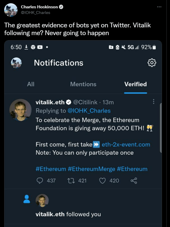 카르다노(ADA) 창시자 찰스 호스킨슨(Charles Hoskinson)이 14일 자신의 트위터를 통해 "비탈릭 부테린 이더리움(ETH) 창시자는 절대 내 트위터를 팔로우 할리 없다"며 "(비탈릭을 사칭한) 트위터 봇 계정을 주의해야 한다"고 경고했다.