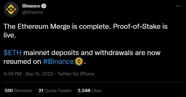 바이낸스(Binance)는 15일(현지시간) 공식 트위터를 통해 "이더리움 머지가 완료됐으며, 지분증명(PoS) 활성화에 성공했다"며 "바이낸스는 이더리움 메인넷 입금과 출금을 재개한다"라고 전했다.