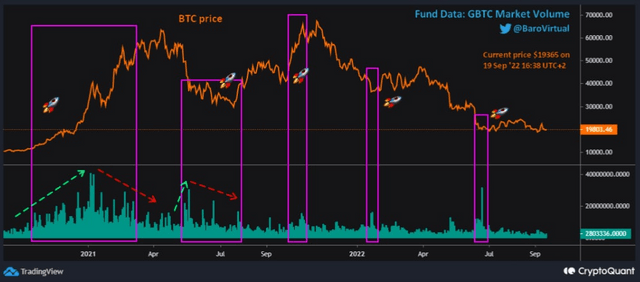 20일(현지시간) 온체인 분석 업체 크립토퀀트의 저자 BaroVirtual은 기고문을 통해 "통상적으로 GBTC 펀드 마켓의 거래량이 적을 경우 비트코인의 불안정 상태가 지속된다"며 "현재 GBTC의 펀드 시장 거래량을 보면 기업(기관)들은 거의 관심이 없음을 알 수 있다"고 설명했다.