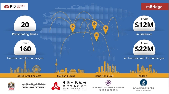 28일(현지시간) 가상자산(암호화폐) 전문 미디어 코인텔레그래프(Cointelegraph) 보도에 따르면 BIS는 "이번 시범 프로그램에는 홍콩, 태국, 중국, 아렙에미리트 중앙은행, 상업은행 20곳이 참여했다"라며 "테스트 플랫폼을 통해 약 1200만달러 상당의 재화가 발행됐으며 참여 기업 간 164건의 외환 거래, 국경 간 결제가 진행됐다. 그 총 가치는 2200만달러에 달한다"라고 밝혔다.