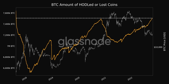28일(현지시간) 가상자산(암호화폐) 분석 플랫폼 글래스노드 데이터에 따르면 비트코인 호들러(강성 홀더) 보유량 혹은 분실 코인 물량이 750만7565.987BTC로 최근 5년 최대치를 기록했다.