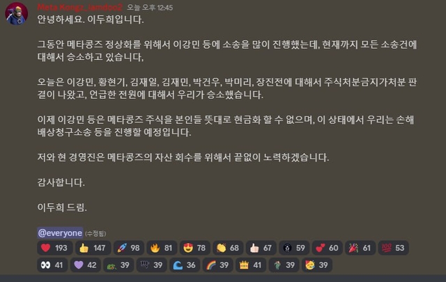 이두희 멋쟁이사자처럼 대표가 메타콩즈의 공식 디스코드 채널을 통해 "이강민, 황현기 등에 대해 주식처분금지가처분 판결이 나왔다"고 5일 밝혔다.