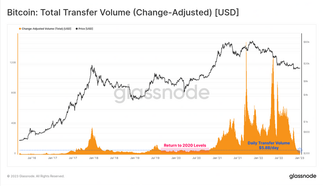 9일(현지시간) 글래스노드 인사이트에 따르면 FTX 붕괴 이후 비트코인 신규 주소는 단기 급증했지만 그 이후로 온체인 활동이 눈에 띄게 냉각했다. 비트코인 네트워크에서 처리한 일일 이체량은 작년 3분기 400억달러에서 현재 58억달러로 추락했다.