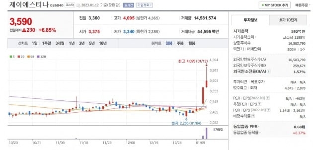 한 주식 투자 전문가는 "윤 대통령 UAE 경제사절단 수혜주로 부각된 제이에스티나는 기업의 본질 가치와 무관하게 테마주 성향으로 움직이고 있다"며 "주가 변동성이 큰 만큼, 단기적으로 트레이딩이 불가능한 사람은 매매를 하지 않는 게 좋다"고 조언했다.