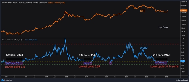 21일 크립토퀀트의 Dan Lim 기고자는 "과거 차트에서 MVRV가 1 이하일 경우 저점 근처, 3.7 이상일 경우 고점 근처인 경우가 많았다"며 이같이 분석했다.