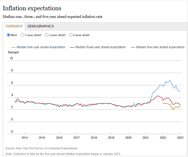뉴욕 연방준비은행이 13일(현지시간) 발표한 1월 소비자 전망 설문조사 결과에 따르면 미국 소비자들은 1년 후 인플레이션율을 5.0%로 전망했다. 이는 2021년 7월 이후 최저치로 전월과 동일하다.
