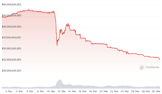 서클이 발행한 스테이블 코인인 USDC 유출이 심화되고 있는 것으로 나타났다. USDC의 시가총액은 지난 2주동안 약 100억달러 급락해 325억달러 규모에 머물렀다.