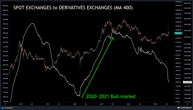 암호화폐 현물 거래소에서 선물 거래소로의 전송량이 증가할 때 강세장이 본격화된다는 주장이 나왔다.