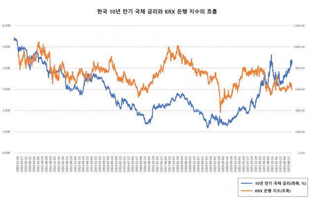 최근 20년간 우리나라 10년 만기 국채 금리와 KRX 은행 지수의 흐름을 보면, 금리 하락기에는 KRX 은행 지수가 반토막 나는 모습도 드물지 않게 연출됐다. 이번에도 그 정도 하락을 염두에 둬야 한다면 최근의 10% 정도 하락은 "시작에 불과하다"는 지적도 있다. 김은갑 키움증권 연구원은 "4분기말과 내년초 NIM이 소폭 상승할 가능성도 있지만 지속적인 상승으로 이어지지는 않을 것"이라고 말했다.
