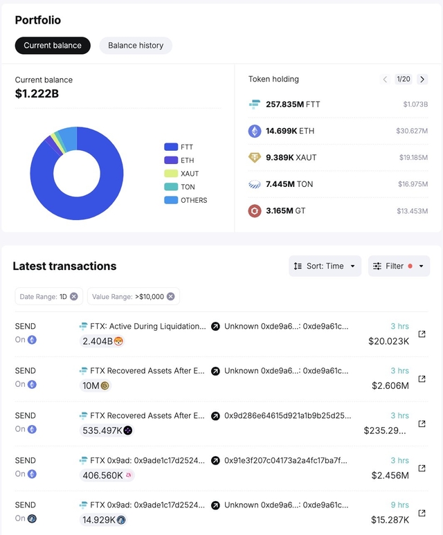 스테픈(GMT) 1000만개(약 258만달러), 유니스왑 40만7000만개(약 241만달러) 시냅스(SYN) 523만개(약 225만 달러) 클레이튼(KLAY) 876만개(약 164만 달러) 팬텀(FTM) 387만개(약118만 달러) 시바이누(SHIB) 777억7000만개(약 64.4만 달러)와 소량의 아비트럼(ARB), 옵티미즘(OP) 등이 FTX와 알라메다 리서치의 주소에서 거래소로 이체 됐다.