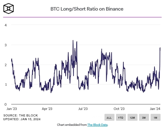 15일(현지시간) 더블록 보도에 따르면 비트코인 롱-숏 포지션 비율은 2.86으로, 지난 24시간 동안 급격히 높아졌다. 이는 현재 트레이더들이 가격 상승을 기대하고 있음을 시사한다.