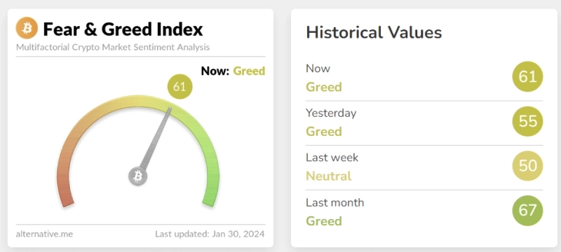 30일(현지시간) 암호화폐 데이터 업체 얼터너티브(Alternative)가 제공하는 공포·탐욕 지수는 전날(55)보다 6포인트 상승한 61포인트를 기록했다.