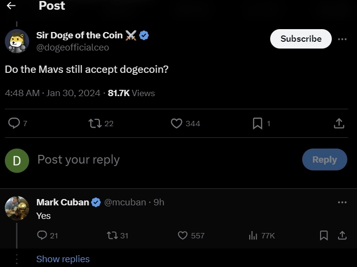 미 NBA 농구팀 댈러스 매버릭스의 구단주 마크 큐반이 댈러스 매버릭스가 여전히 도지코인(DOGE)을 결제수단으로 허용한다고 밝혔다.