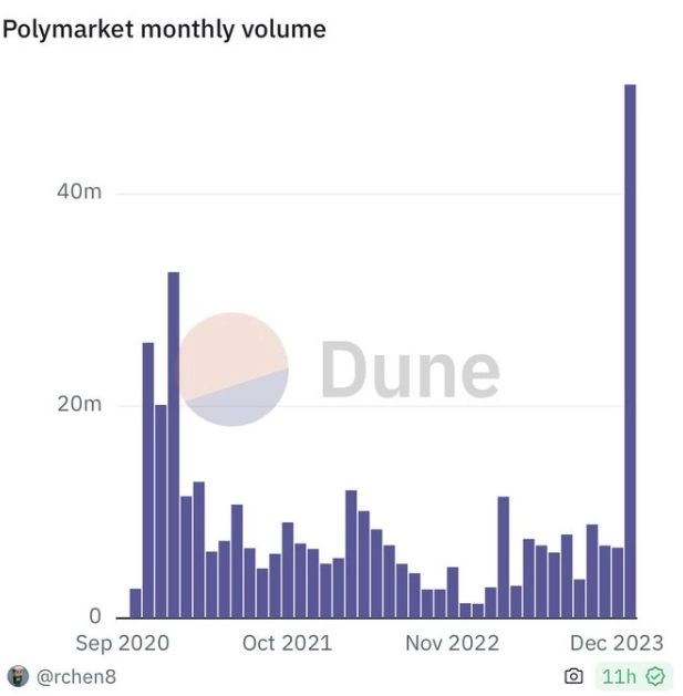 30일(현지시각) 가상자산(암호화폐) 투자회사인 원컨퍼메이션(1confirmation)의 설립자 닉 토마이노(Nick Tomaino)는 X를 통해 "온체인 예측 시장(폴리마켓)의 1월 거래량이 처음으로 5000만 달러를 돌파했다"라고 밝혔다.