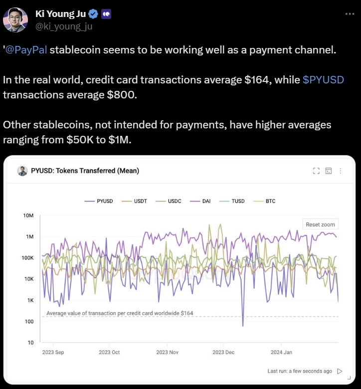 31일 온체인 데이터 분석 플랫폼 크립토퀀트(CryptoQuant)의 주기영 대표는 자신의 X(트위터)를 통해 “페이팔이 발행한 PYUSD가 결제수단으로 작동하고 있는 것으로 보인다. PYUDS의 평균 결제금액은 약 800달러로 신용카드(164달러)보다는 높지만 시장에 정착해 잘 활용되고 있다”라고 설명했다.