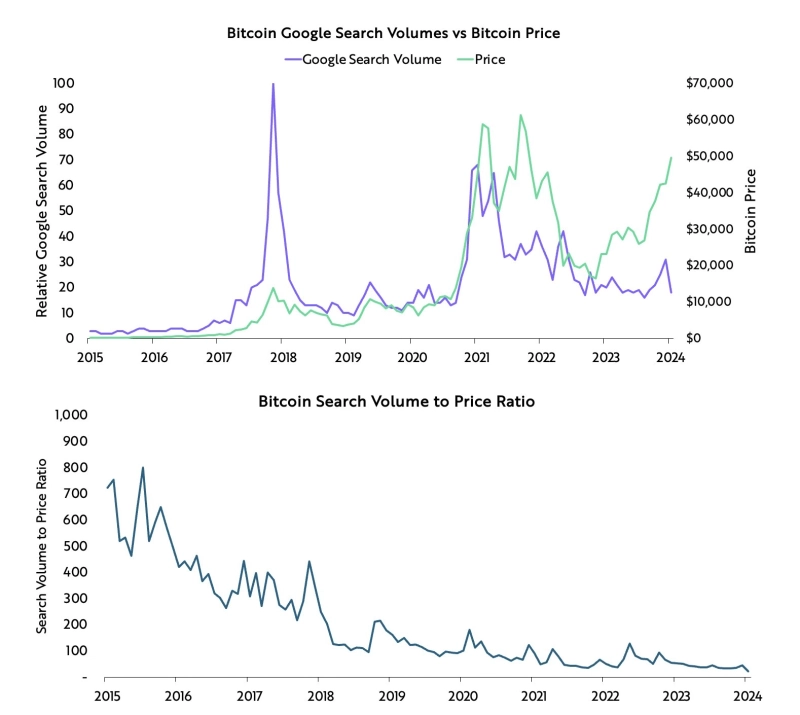 13일(현지시각) 야신 엘만드라(Yassine Elmandjra) 아크 인베스트먼트 분석가는 X를 통해 "비트코인이 5만 달러를 돌파했지만, 여전히 구글 검색량은 가격 대비 최저 수준"이라고 밝혔다. 이는 비트코인 가격은 상승했지만, 아직 시장에 2021년과 유사한 '비트코인 열풍'이 찾아오지 않았음을 시사한다.