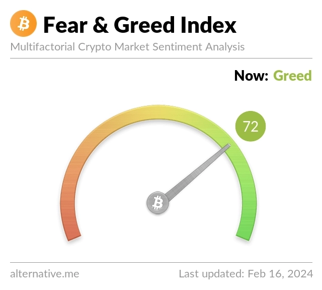 16일 암호화폐 데이터 업체 얼터너티브(Alternative)가 제공하는 공포·탐욕 지수는 전날(72)과 동일한 72포인트를 기록했다.