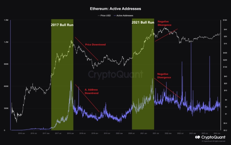 16일 온체인 분석업체 크립토퀀트 기고자 불파이터(Bullfighter)는 보고서를 통해 "역사적으로 이더리움 활성 주소 수와 가격 사이에 상관관계가 있다"며 "최근 이더리움 가격에 비해 활성 주소 수가 낮다"고 밝혔다. 활성 주소 수는 네트워크에 대한 사용자들의 관심과 거래량 증가를 반영하는 지표다.