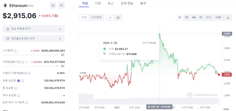 20일 오후 5시 3분 현재 이더리움은 코인마켓캡 기준 전일 대비 0.09% 하락한 2920.39달러를 기록 중이다. 이날 이더리움은 장중 한때 2980달러를 기록, 3000달러에 근접했으나 현재는 상승폭을 소폭 줄인 모양새다.