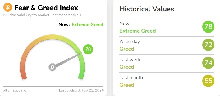 20일(현지시각) 가상자산 분석업체인 얼터너티브(Alternative)가 제공하는 공포·탐욕 지수는 현재 100점 만점 기준 78점으로, '탐욕' 단계에서 '극도의 탐욕' 단계로 진입했다. 전날 지수는 72점(탐욕)을 기록했다.