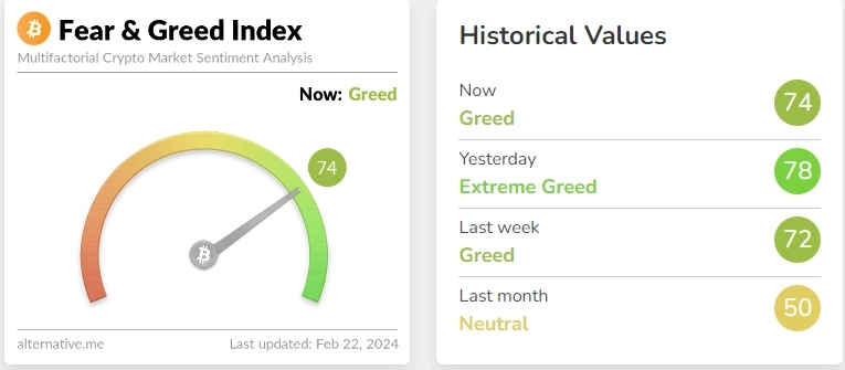 21일(현지시각) 가상자산 분석업체인 얼터너티브(Alternative)가 제공하는 공포·탐욕 지수는 현재 100점 만점 기준 74점으로, '극도의 탐욕' 단계에서 '탐욕' 단계로 진입했다. 전날 지수는 78점(극도의 탐욕)을 기록했다.