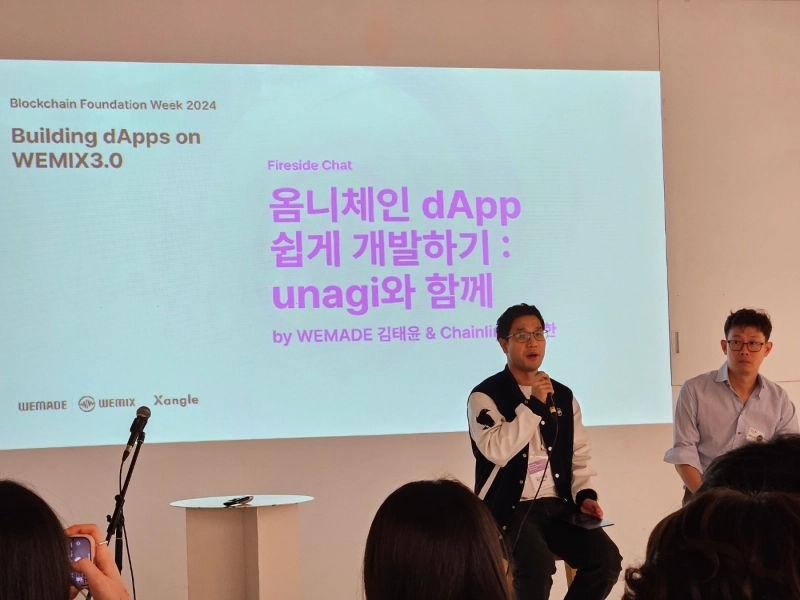 22일 열린 '2024 쟁글 블록체인 파운데이션 위크'에서는 김태윤 위메이드 블록체인 팀장, 정승환 체인링크(LINK) 한국 총괄이 참석해 위메이드의 새 프로젝트 '우나기(Unagi)'에 대해 소개하는 시간을 가졌다. 우나기는 옴니체인(여러개의 체인 생태계를 마치 하나의 체인처럼 사용할 수 있는 네트워크) 기술을 도입한 위메이드의 새로운 플랫폼이다.