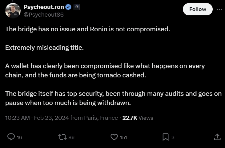 23일 알렉산더 레너드 라슨 로닌 COO는 X(트위터) 계정을 통해 "이날 발생한 사고는 로닌 브릿지 해킹이 아닌 월렛 해킹에 의해 발생했다"며 커뮤니티에서 제기된 브릿지 해킹 의혹에 대해 해명했다. 이어 그는 "해킹된 자금은 토네이도캐시(TORN)를 통해 현금화되고 있다"고 말했다.