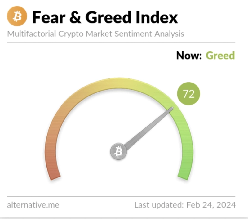 24일 가상자산 데이터 제공 업체 얼터너티브(Alternative)의 공포·탐욕 지수는 전날 대비 4포인트 하락한 72포인트를 기록, 탐욕 단계로 내려왔다. 해당지수는 전날 76포인트를 기록하며 극단적 탐욕단계를 기록했으나 비트코인 등 메이저 알트코인들의 하락세로 투자 수요가 소폭 줄어든 모양새다.