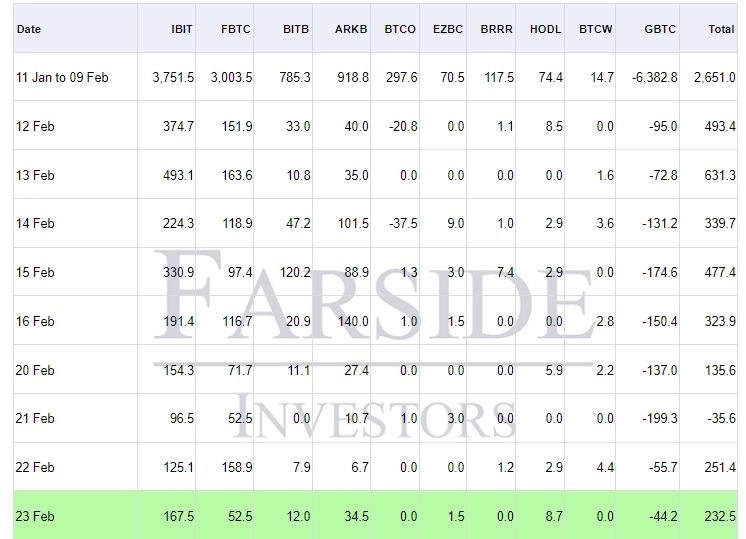 이날 비트코인 현물 ETF는 순유입 2억3250만달러를 기록했다. 유입량 순위로 보면 블랙록의 IBIT가 전체 유입량의 50%가 넘는 1억6750만달러를 기록하며 1위에 올랐다. 이어 피델리티의 FBTC(5250만달러), 아크인베스먼트의 ARKB(3450만달러), 비트와이즈의 BITB(1200만달러) 등이 뒤를 이었다.