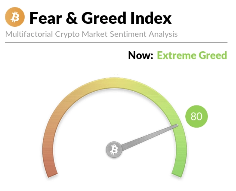 29일(현지시간) 가상자산 데이터 제공 업체 얼터너티브(Alternative)의 데이터에 따르면 공포·탐욕 지수는 80포인트를 기록했다. 전날 비트코인(BTC)이 몇몇 국가에서 역대 최고가를 달성하며 적극적인 투자 수요가 지속되는 모양새다.