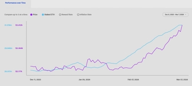 덴쿤 업그레이드에 스테이킹 기능 개선 제안들이 포함되자 이더리움 스테이킹 물량도 꾸준히 증가세를 보이고 있습니다. 스테이크 리워드 데이터에 따르면 비콘체인 네트워크 내 스테이킹된 이더리움 물량은 연초 이후 9% 이상 증가해 현재 3135만8000 ETH에 달합니다.