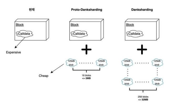 그러나 이번 업데이트로 적용되는 프로토 댕크샤딩에서는 블록당 2MB의 블롭 데이터 저장 공간만을 제공합니다. 댕크샤딩의 전초 단계격인만큼, 댕크샤딩에서 목표로 하고 있는 32MB의 블롭 데이터 스펙에는 크게 미치지 못하지만, 이만큼의 여유 데이터 공간만으로도 상당한 비용 절감 효과를 만들어낼 수 있습니다.